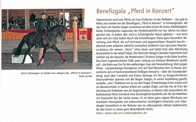 Eine wahrlich außergewöhnliche Veranstaltung machte das kleine Städtchen Schweighofen an der Südlichen Weinstraße Mitte Juni erneut zum Mekka der Freunde ästhetischer Reiterei: Impressionen rund ums Pferd, ein Live-Orchester an der Reitbahn – und das zu Gunsten von Kindern, deren Schicksal es nicht ganz so gut mit ihnen meint. Ein veritables Schmankerl, das das Team um Familie Geiger da vor vier Jahren ins Leben gerufen hat …