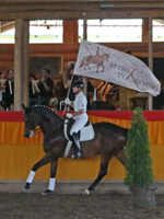Schon traditionell brachte der temperamentvolle und elegante Cantador Moderatorin Dr. Christina Klein in die Bahn – wahrlich ein Auftritt mit Grandezza. Einmal mehr durfte man ihrer Einladung folgen und sich in eine andere Welt abseits des alltäglichen Stresses begeben. Musikstücke von Vivaldi und Haydn eröffneten das Konzert. Den reiterlichen Auftakt machte Hausherr Otto Geiger auf dem bereits weit geförderten, wunderschönen Lusitanohengst Brandymel.